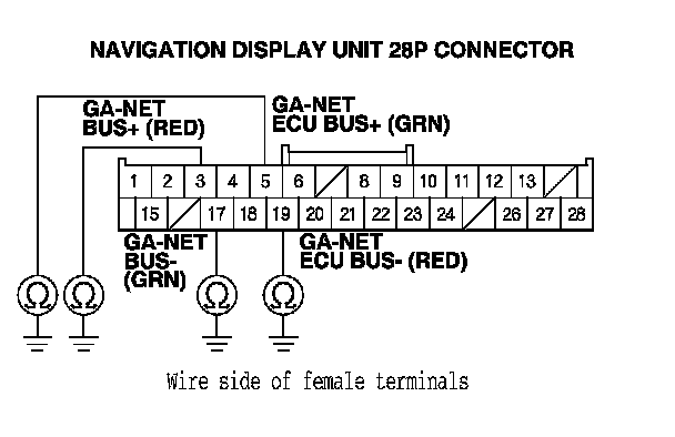13. Check for continuity between body ground and navigation display unit 28P connector terminals No. 3, No. 5 No. 17, and No. 19 individually.