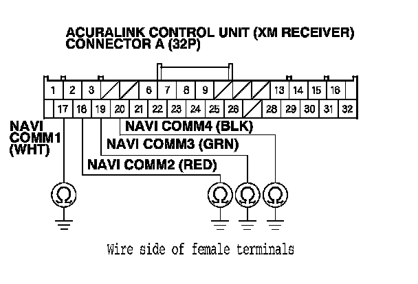 13. Check for continuity between AcuraLink control unit (XM receiver) connector A (32P) terminals No. 17, No. 18, No. 19, and No. 20 and body ground.