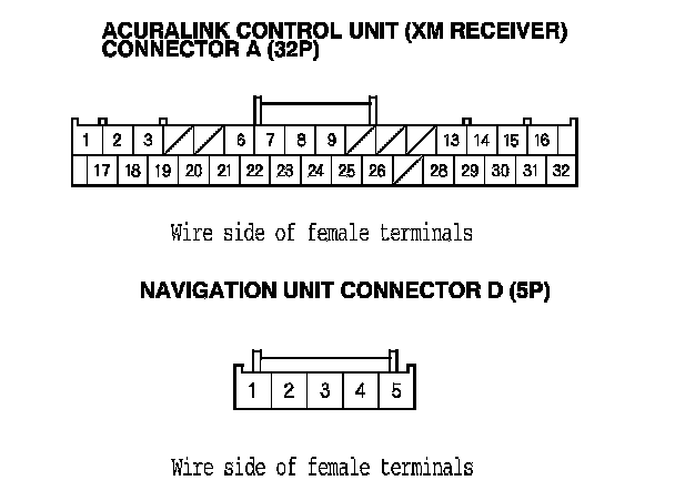 15. Check for continuity between the terminals of AcuraLink control unit (XM receiver) connector A (32P) and navigation unit connector D (5P) according to the table.