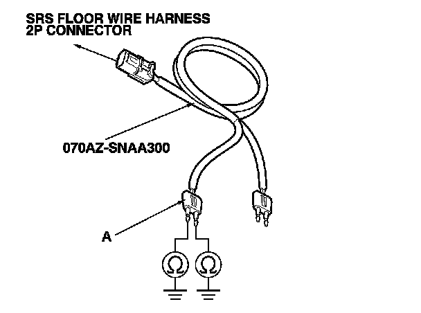 15. Measure the resistance between each terminal of the black SRS simulator lead (A) and body ground. There should be an open circuit or at least 1 MOhms.