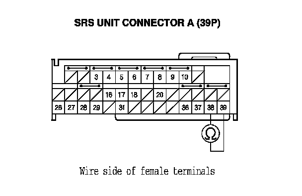 16. Measure the resistance between SRS unit connector A (39P) terminals No. 38 and No. 39. There should be less than 1.0 Ohms.
