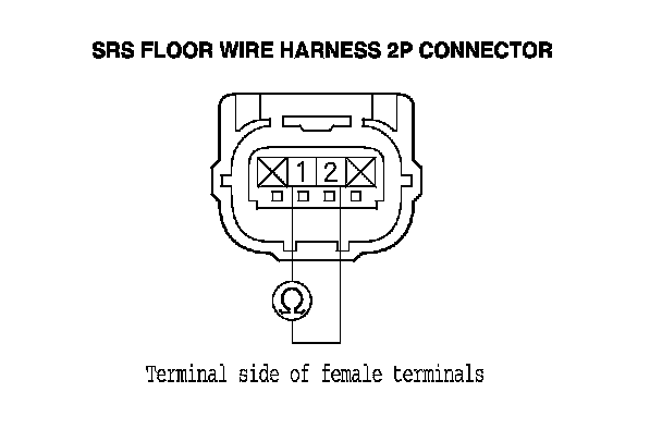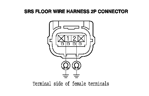 15. Measure the resistance between SRS floor wire harness 2P connector terminals No. 1 and No. 2. There should be less than 1.0 Ohms.