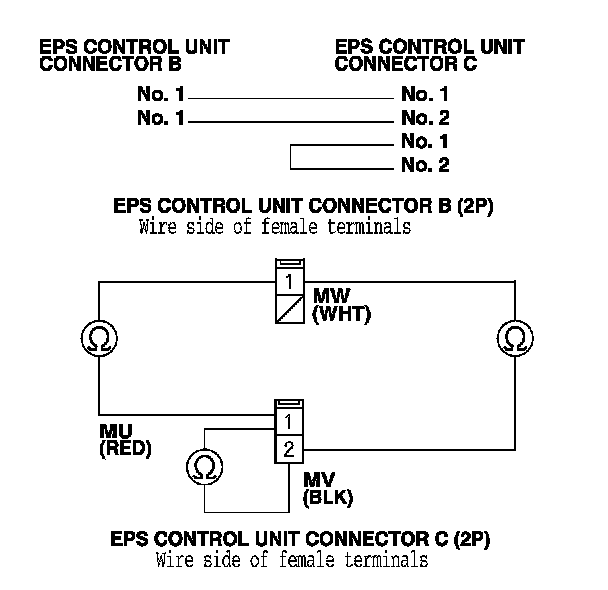 9. Check for continuity between the following terminals of EPS control unit connector B (2P) and connector C (2P).