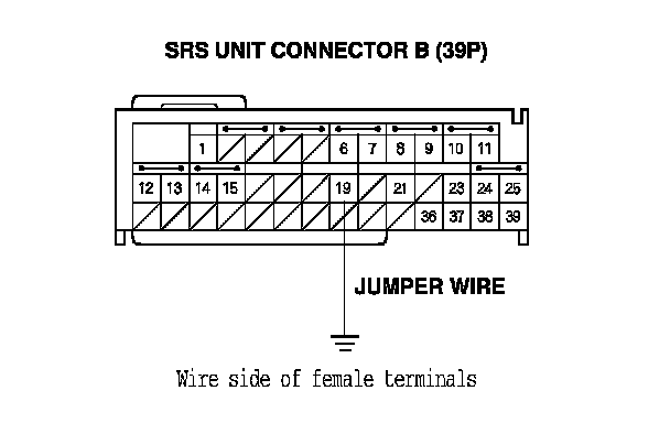 6. Install a jumper wire between SRS unit connector B (39P) terminal No. 19 and body ground.