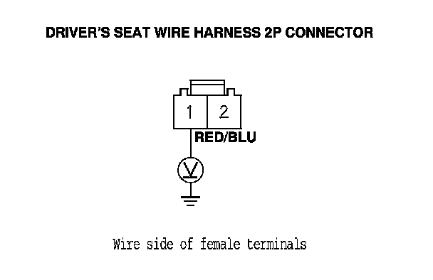 13. Measure the voltage between driver's seat wire harness 2P connector terminal No. 1 and body ground. There should be more than 10 V.