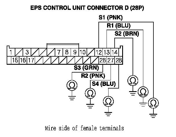 10. Check for continuity between body ground and EPS control unit connector D (28P) terminal No. 12, terminal No. 13, terminal No. 14, terminal No. 26, terminal No. 27, and terminal No. 28 individually.