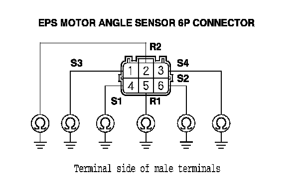 12. On the sensor side, check for continuity between body ground and EPS motor angle sensor 6P connector terminal No. 1, terminal No. 2, terminal No. 3, terminal No. 4, terminal No. 5, and terminal No. 6 individually.