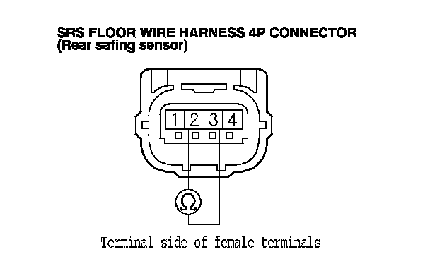 10. Measure the resistance between SRS floor wire harness 4P connector (Rear safing sensor) terminals No. 2 and No. 3. There should be an open circuit or at least 1 MOhms.