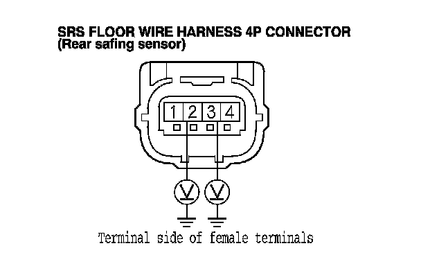 14. Measure the voltage between body ground and SRS floor wire harness 4P connector (Rear safing sensor) terminals No. 2 and No. 3, individually. There should be less than 0.2 V.