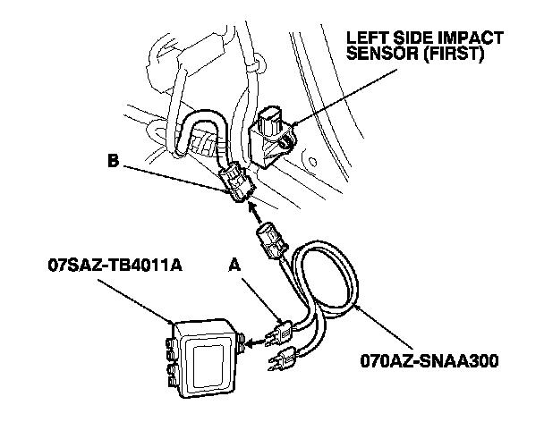 16. Connect the SRS inflator simulator (jumper connector) and the black lead (A) of simulator lead L to the SRS floor wire harness 4P connector (B).