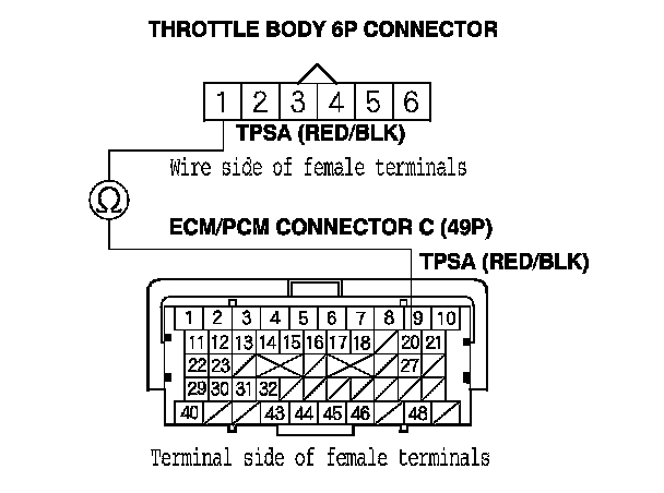 17. Check for continuity between ECM/PCM connector terminal C43 and throttle body 6P connector terminal No. 4.