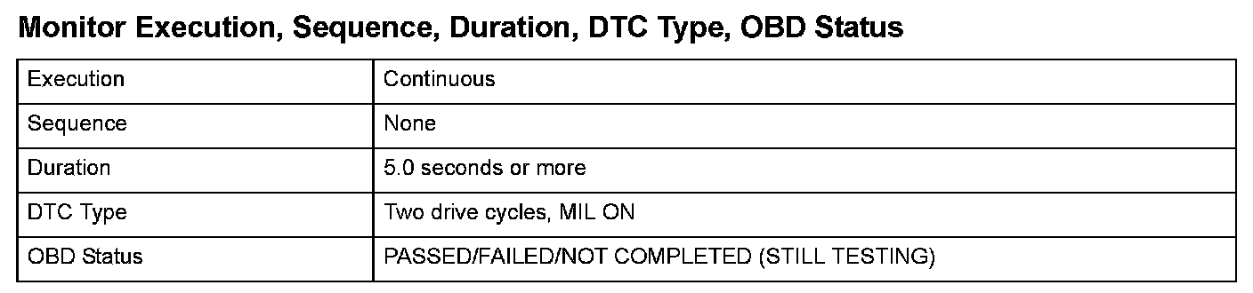 Monitor Execution, Sequence, Duration, DTC Type, OBD Status