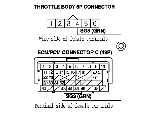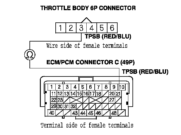 12. Check for continuity between ECM/PCM connector terminal C21 and throttle body 6P connector terminal No. 3.