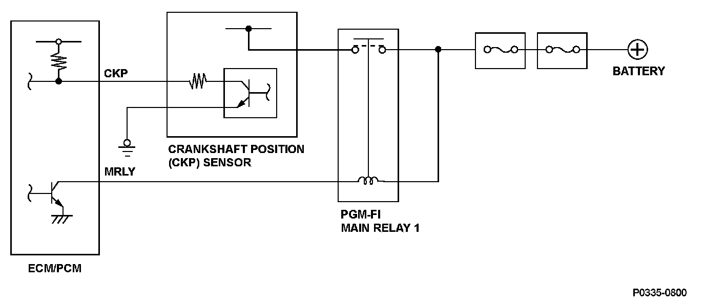 The crankshaft position (CKP) sensor consists of a rotor and a semiconductor that detects rotor position. When the engine starts, the rotor turns and the magnetic flux in the semiconductor device changes. The changes of magnetic flux are converted into pulsing signals to the engine control module (ECM)/powertrain control module (PCM). The CKP sensor detects injection/ignition timing for each cylinder and engine speed. If an abnormal amount of pulsing signals from the CKP sensor are detected, a malfunction is detected and a DTC is stored.