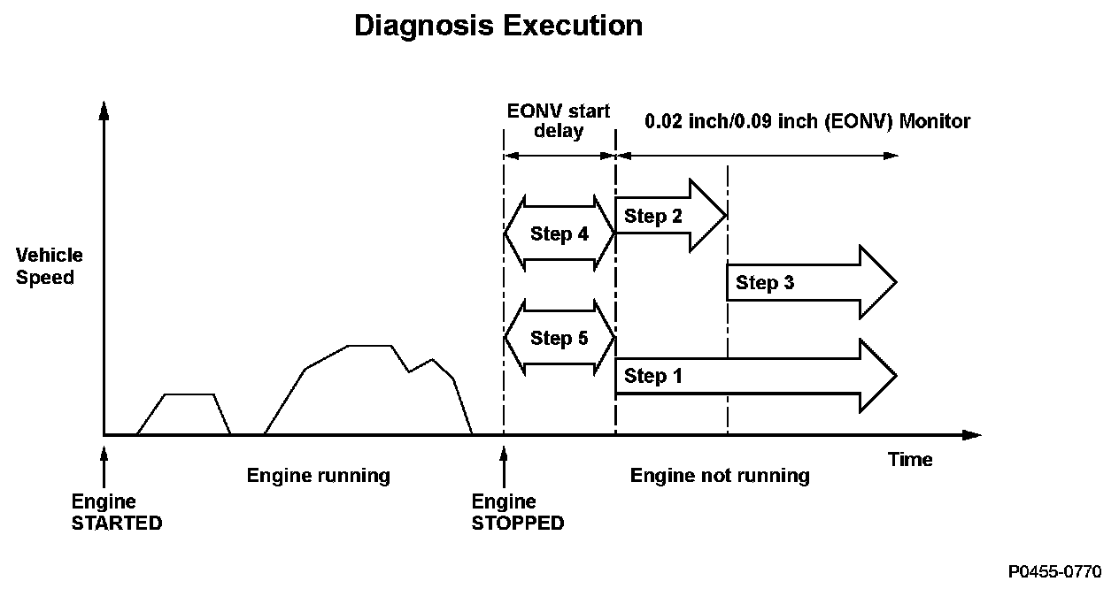 After the engine has stopped, the ECM/PCM monitors the variation of the FTP sensor output to detect "no 0.02 inch leak" depending on the variation corresponding to the increasing pressure inside the fuel tank.