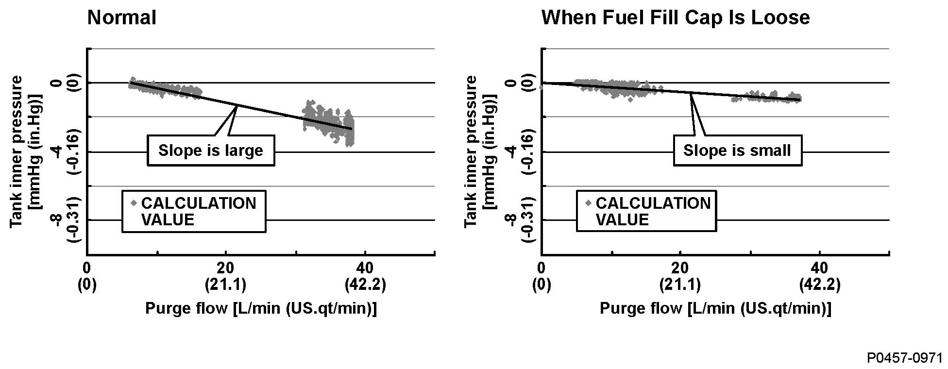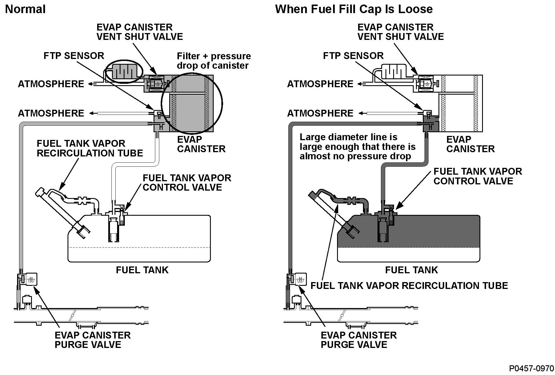When the fuel fill cap is installed properly, the purge flow occurs due to the airflow resistance of the canister, and tank pressure will be reduced. When the fuel fill cap is loosened, the fuel tank pressure will not decrease even when the airflow resistance decreases and the purge flow occurs, because air is being exhausted from the tank to the atmosphere.