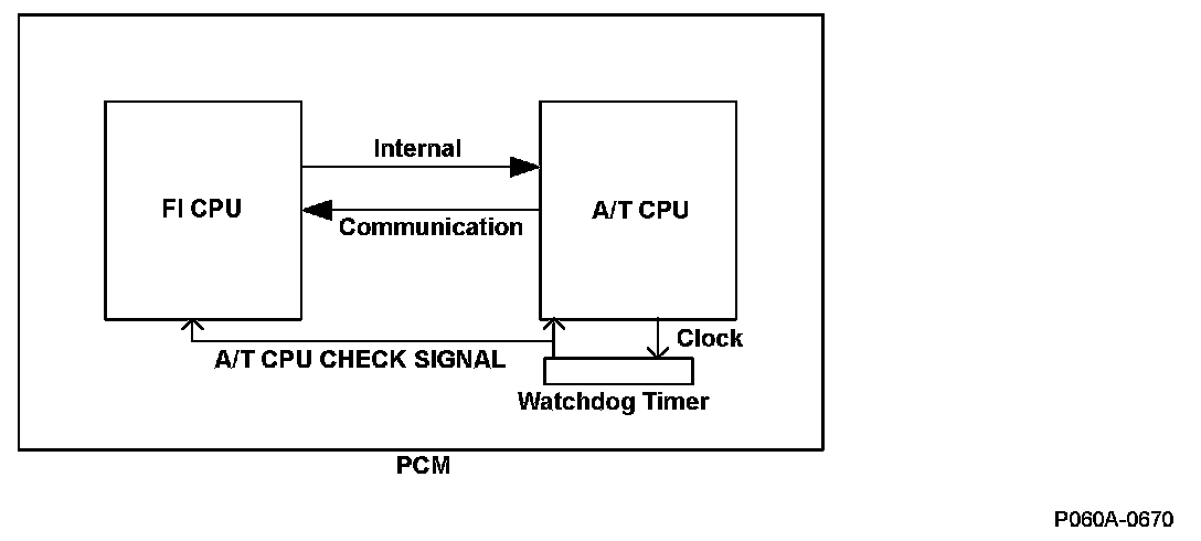 When a malfunction occurs in the internal communication between the FI CPU and the A/T CPU in the powertrain control module (PCM) and the internal communication is interrupted for a set time or more, or when the watchdog timer that monitors the A/T CPU detects an abnormality in the A/T CPU and notifies the FI CPU via the A/T CPU check signal line, the PCM detects a malfunction and a DTC is stored.