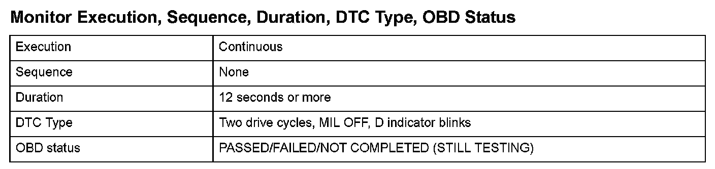 Monitor Execution, Sequence, Duration, DTC Type, OBD Status