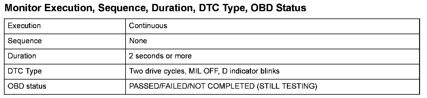 Monitor Execution, Sequence, Duration, DTC Type, OBD Status