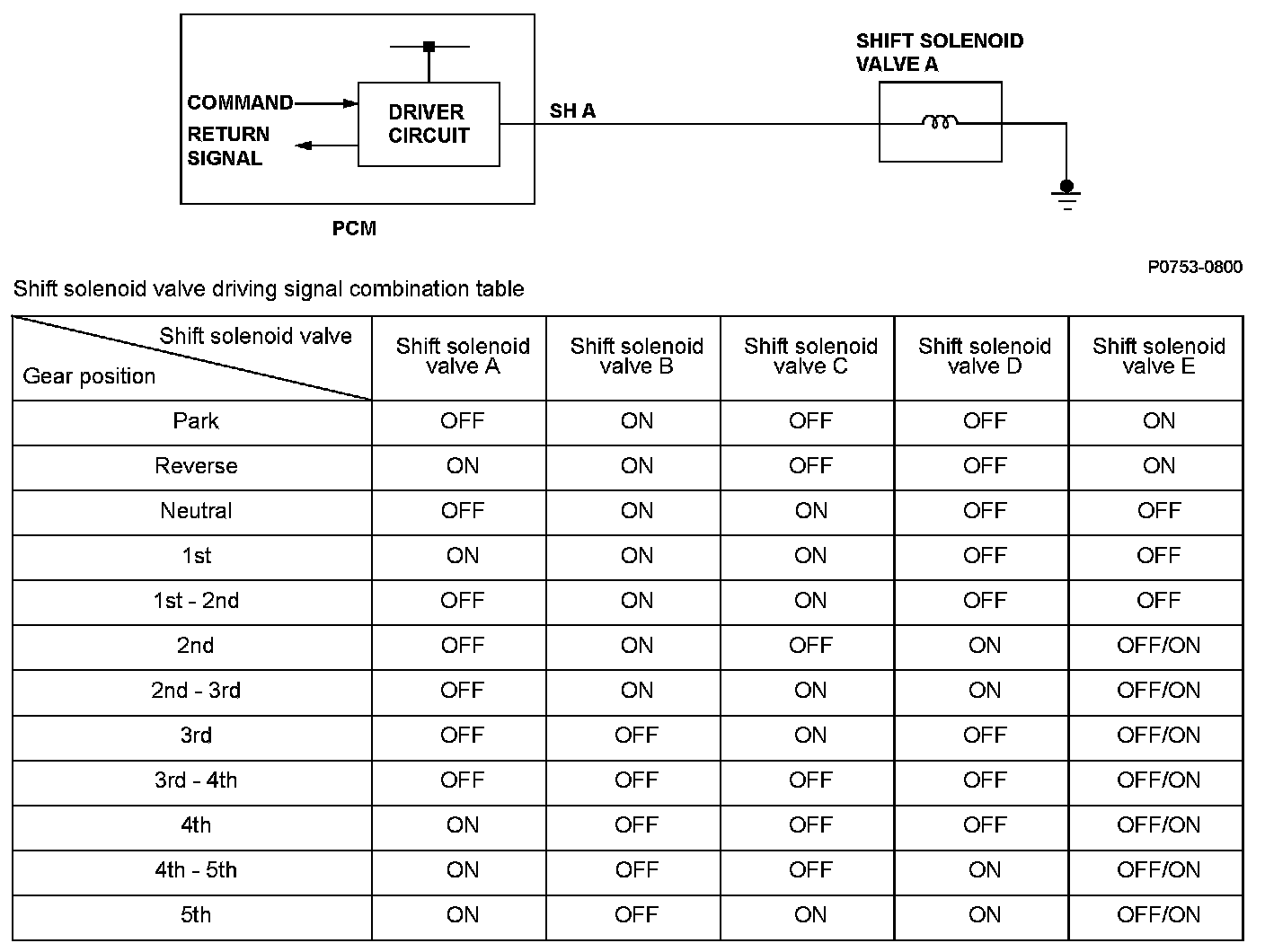 When shift solenoid valves A, B, C, D, and E are turned ON, the hydraulic pressure circuit opens. The hydraulic pressure circuit supplies/discharges hydraulic pressure to/from each clutch according to the combination of the ON/OFF status of those valves and the shift valves. The powertrain control module (PCM) commands the driver circuit to turn on the shift solenoid valve. The circuit diagnosis malfunctions such as a circuit short or open, and sends back a return signal during the PCM's command. When the return signal does not match the PCM command, a malfunction is detected by the PCM. The malfunction is detected when the return signal does not match the PCM command to turn ON the shift solenoid valve, and a DTC is stored.