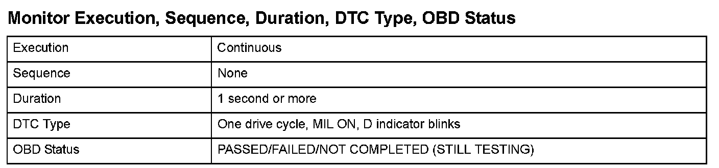 Monitor Execution, Sequence, Duration, DTC Type, OBD Status