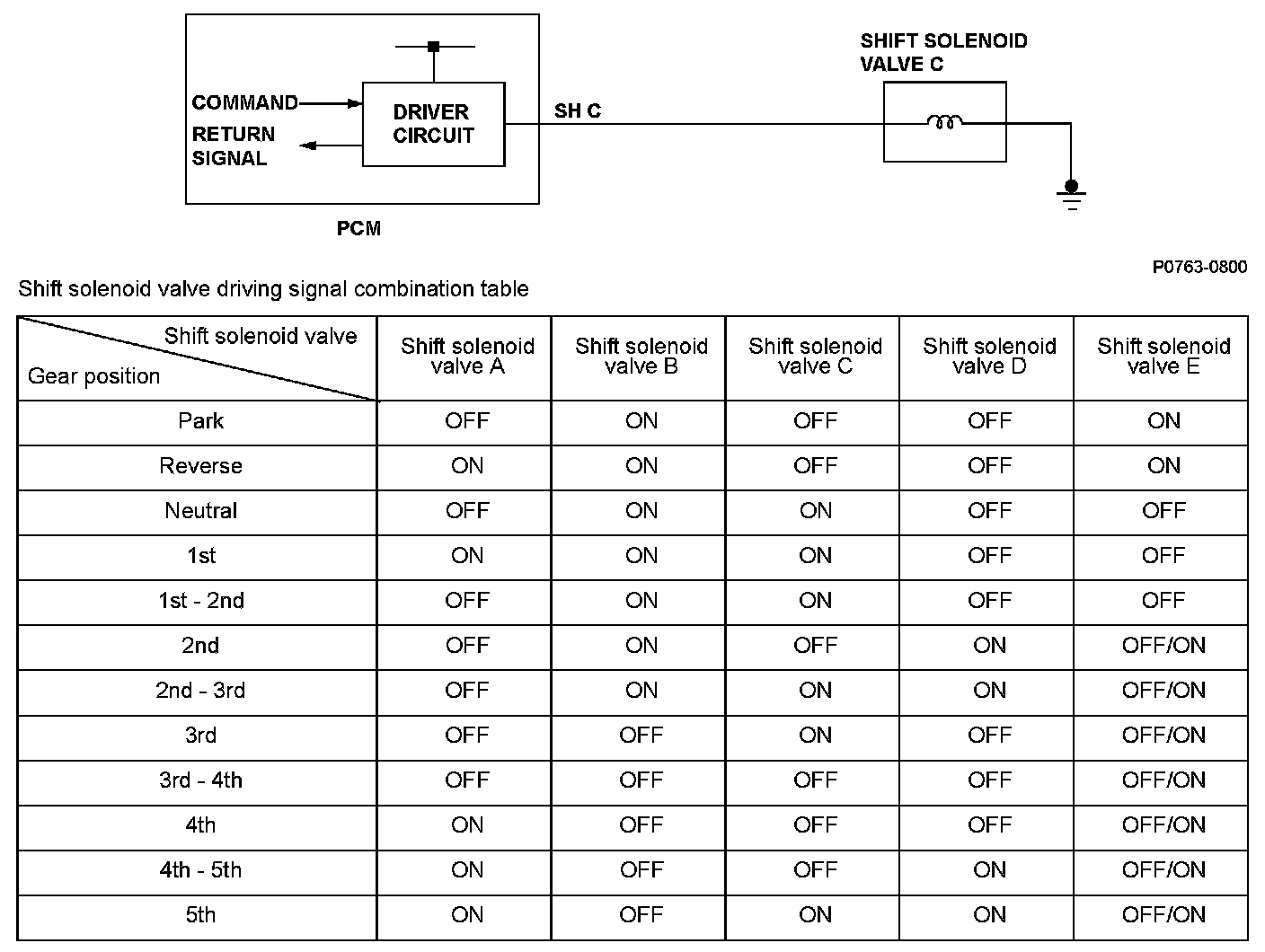 When shift solenoid valves A, B, C, D, and E are turned ON, the hydraulic pressure circuit opens. The hydraulic pressure circuit supplies/discharges hydraulic pressure to/from each clutch according to the combination of the ON/OFF status of those valves and the shift valves. The powertrain control module (PCM) commands the driver circuit to turn on the shift solenoid valve. The circuit diagnosis malfunctions such as a circuit short or open, and sends back a return signal during the PCM's command. When the return signal does not match the PCM command, a malfunction is detected by the PCM. The malfunction is detected when the return signal does not match the PCM command to turn ON the shift solenoid valve, and a DTC is stored.