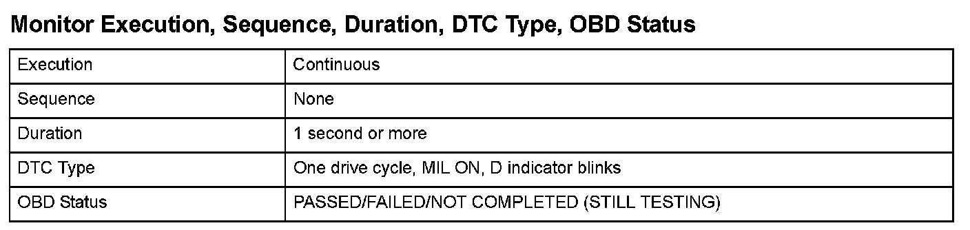 Monitor Execution, Sequence, Duration, DTC Type, OBD Status