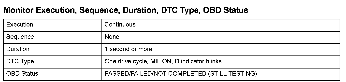 Monitor Execution, Sequence, Duration, DTC Type, OBD Status