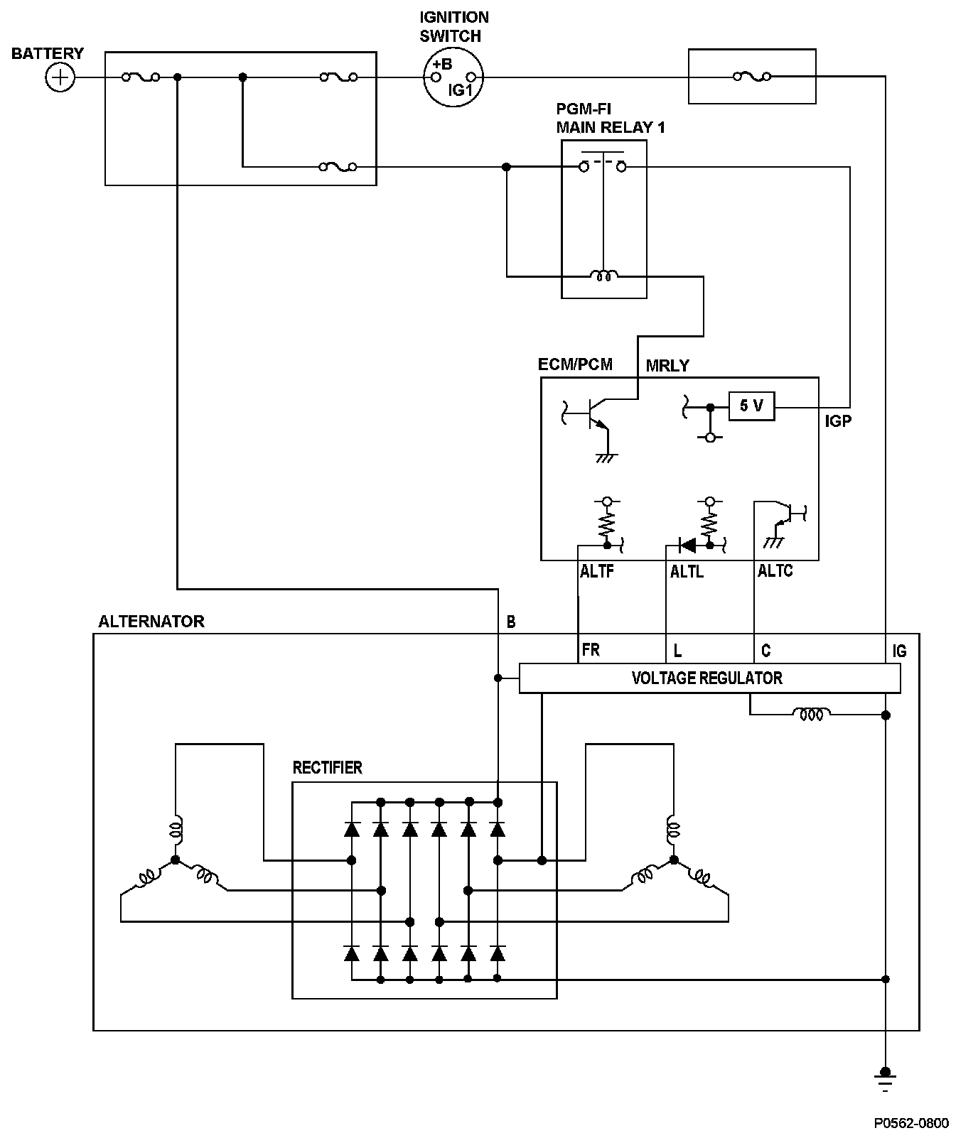 The alternator is driven by the engine, and it generates electricity to supply the necessary power to the electrical system and to charge the battery. The alternator voltage target values of 14.5 V and 12.5 V are achieved by switching the alternator control mode (controlled by the engine control module (ECM)/powertrain control module (PCM)). The alternator output signal is sent to the ECM/PCM, and it varies according to the battery's state of charge, the electrical load, and the engine speed. When the IGP terminal voltage of the ECM/PCM is a set value or more for a set time, a malfunction is detected and a DTC is stored.