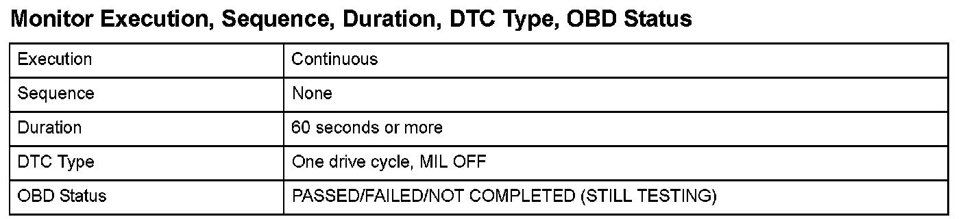 Monitor Execution, Sequence, Duration, DTC Type, OBD Status