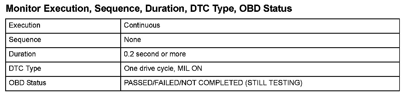 Monitor Execution, Sequence, Duration, DTC Type, OBD Status