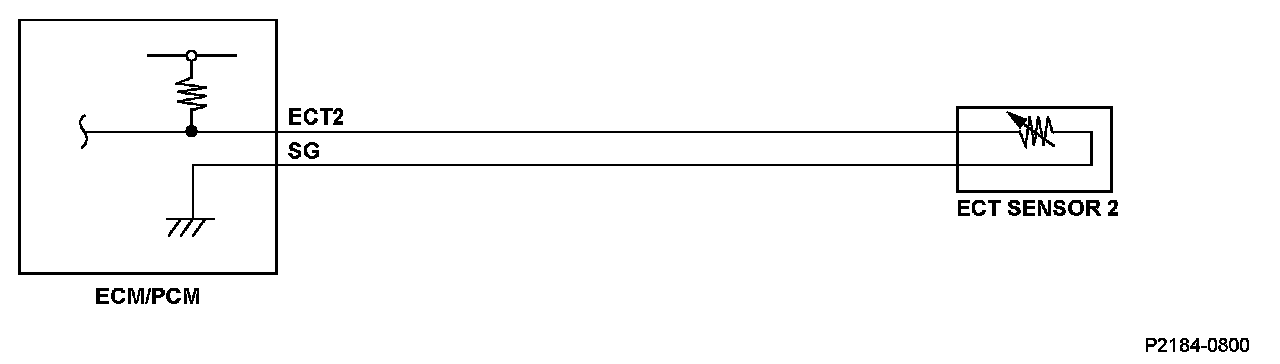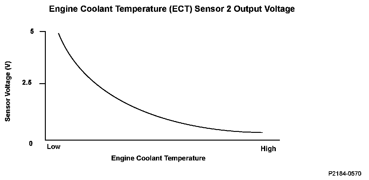 Engine coolant temperature (ECT) sensor 2 is a thermistor attached to the radiator. The engine control module (ECM)/powertrain control module (PCM) applies voltage (about 5 V) to the ECT2 signal circuit through a pull up resistor. As the engine coolant temperature cools, ECT sensor 2 resistance increases, and the ECM/PCM detects a high signal voltage. As the engine coolant warms, the sensor resistance decreases, and the ECM/PCM detects a low ECT2 signal voltage. If the ECT sensor 2 output voltage is more than a set value when the engine coolant temperature is low, the ECM/PCM detects a malfunction and a DTC is stored.
