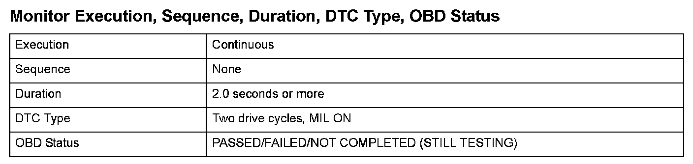 Monitor Execution, Sequence, Duration, DTC Type, OBD Status