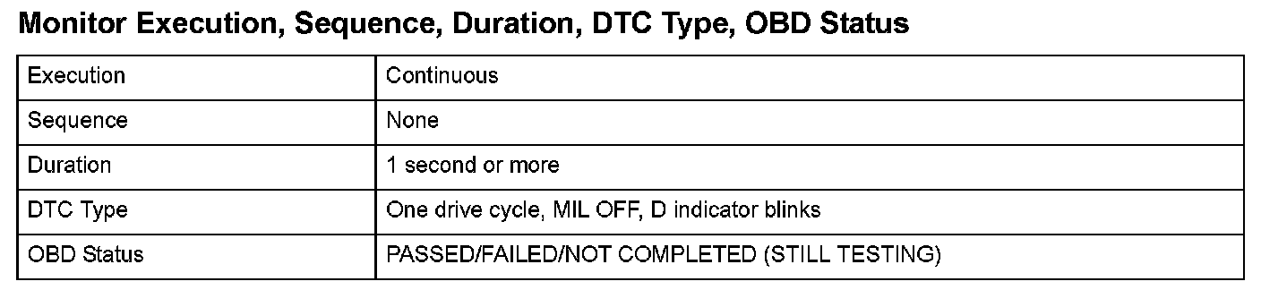 Monitor Execution, Sequence, Duration, DTC Type, OBD Status