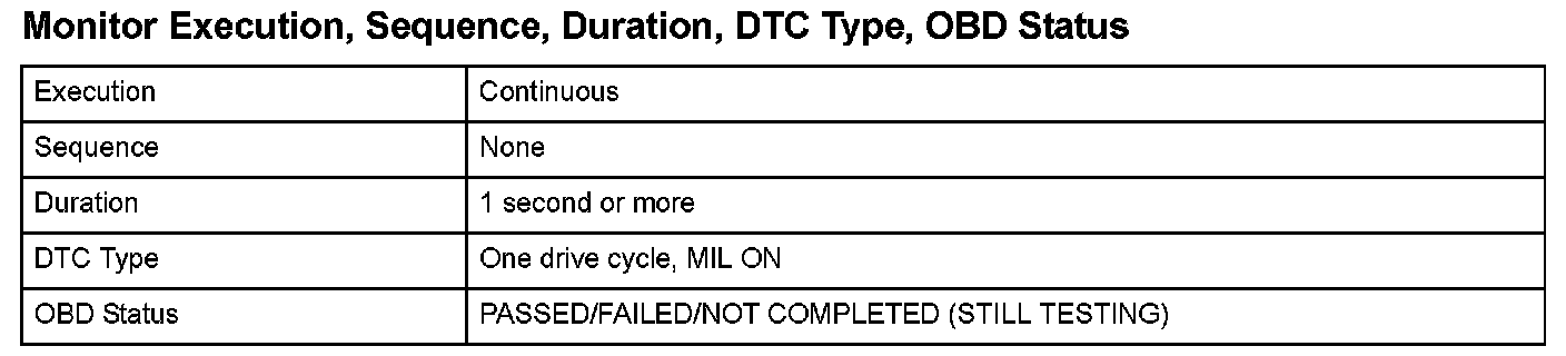 Monitor Execution, Sequence, Duration, DTC Type, OBD Status