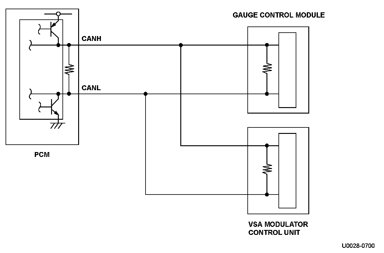 The controller area network (CAN) transmits/receives pulsing signals to/from the control modules simultaneously by using two signal lines (CANH and CANL). When the powertrain control module (PCM) does not receive the signals via the CAN lines for more than a set time, the PCM detects a malfunction and a DTC is stored.