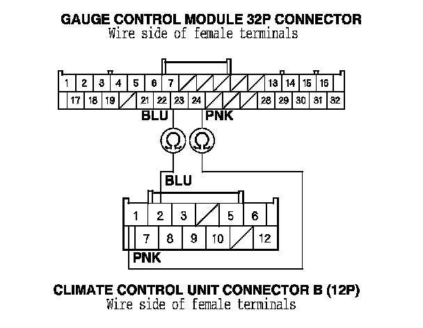 9. Check for continuity between the following terminals of the gauge control module 32P connector, and climate control unit connector B (12P).