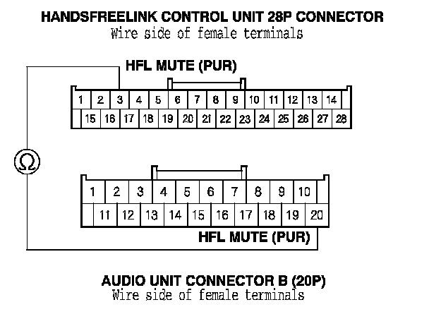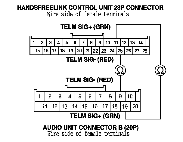 16. Check for continuity between HandsFreeLink control unit 28P connector terminal No. 3 and audio unit connector B (20P) terminal No. 20.