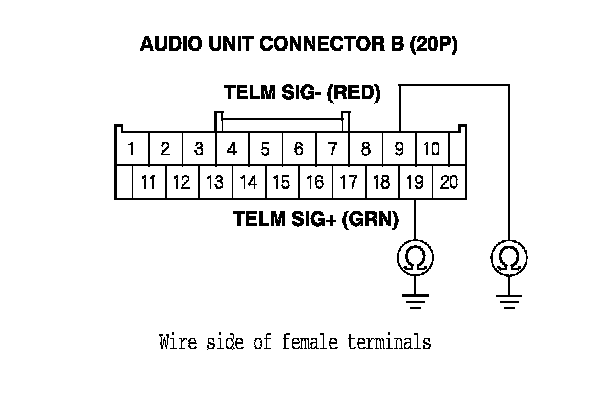 11. Check for continuity between body ground and audio unit connector B (20P) terminals No. 9 and No. 19 individually.