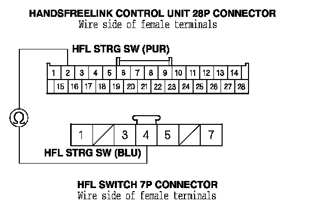 20. Check for continuity between HandsFreeLink control unit 28P connector terminal No. 2 and HFL switch 7P connector terminal No. 4.