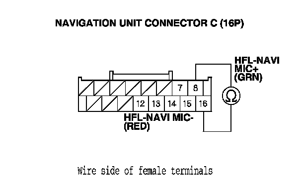 13. Check for continuity between navigation unit connector C (16P) terminals No. 8 and No. 16.