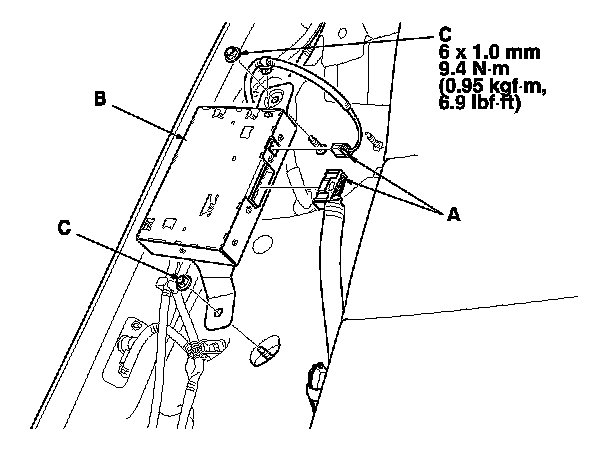 3. Remove the mounting nuts (C) and the AcuraLink control unit (XM receiver).