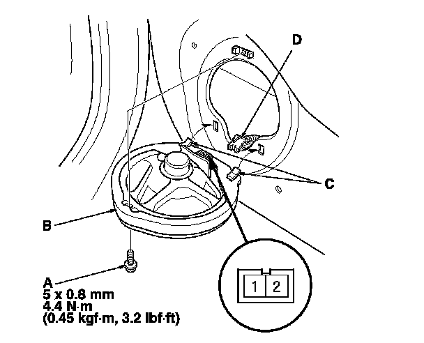 3. Disconnect the 2P connector (D), and remove the speaker.