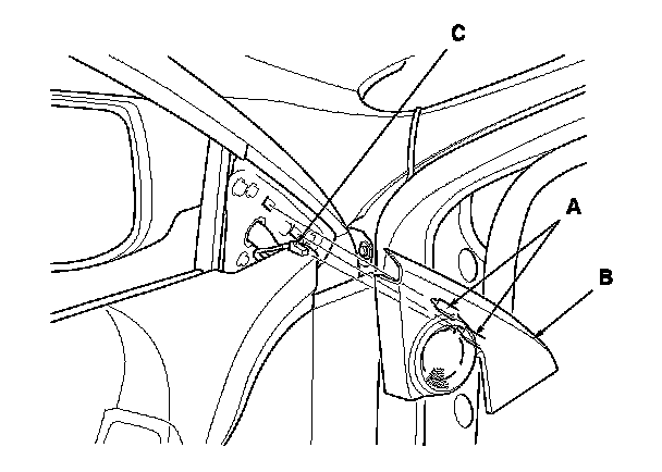 1. Detach the clips (A) and remove the front door tweeter cover (B). Then disconnect the connector (C).