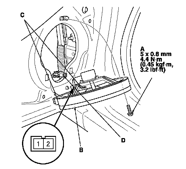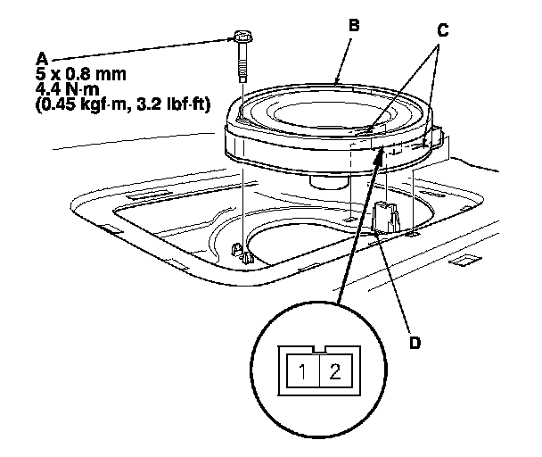 3. Disconnect the connector (D), and remove the rear speaker.