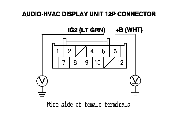 5. Measure the voltage between body ground and audio-HVAC display unit 12P connector terminals No. 5 and No. 6 individually.