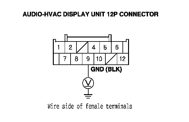 13. Check for continuity between the terminals of the audio-HVAC display unit 12P connector and body ground according to the table. Then check for continuity between the same terminals listed in the table and audio unit connector B (20P) terminal No. 16.