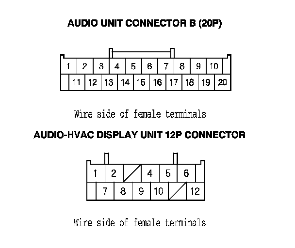 2. Check the connections at the audio-HVAC display unit 12P connector and audio unit connector B (20P).