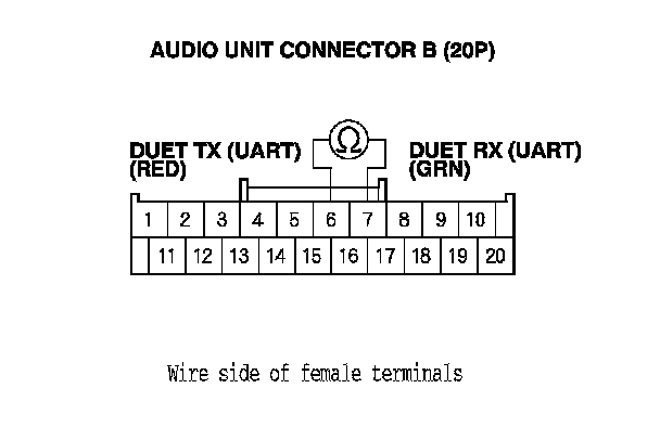 14. Check for continuity between audio unit connector B (20P) terminals No. 6 and No. 7.