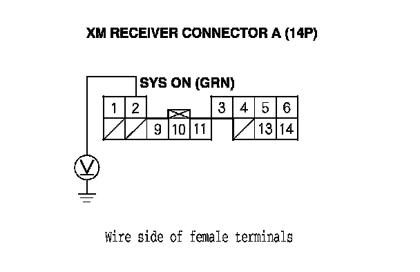 15. Measure the voltage between XM receiver connector A (14P) terminal No. 1 and body ground.